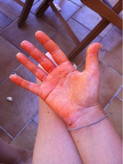 Tache de henné au reveille. Voilà lundi en allant dans la salle de bain et en voulant me lavais jai remarqué des traces orange sur les paumes de mes mains un peu comme ci je lavais mis puis enlevé ou dormi dessus. A celles qui ont decoudéco ces tâches consulter très rapidement un neurologue qui vous prescrire une prise de sang avec recherche danticorps et plus eczexactem le SCL 70 courage à vous.
