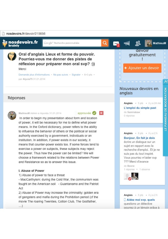 Oral Bac Anglais Notion Lieux Et Formes Du Pouvoir Demande De Correction Bonjour Qui Peut Nosdevoirs Fr