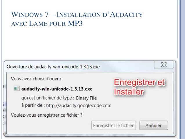 Les messages derreurs survenant le plus souvent sont. Le fichier que tu a telcharger il se trouve dans CProgram FilesAudacity. Installation Lame pour Audacity.
